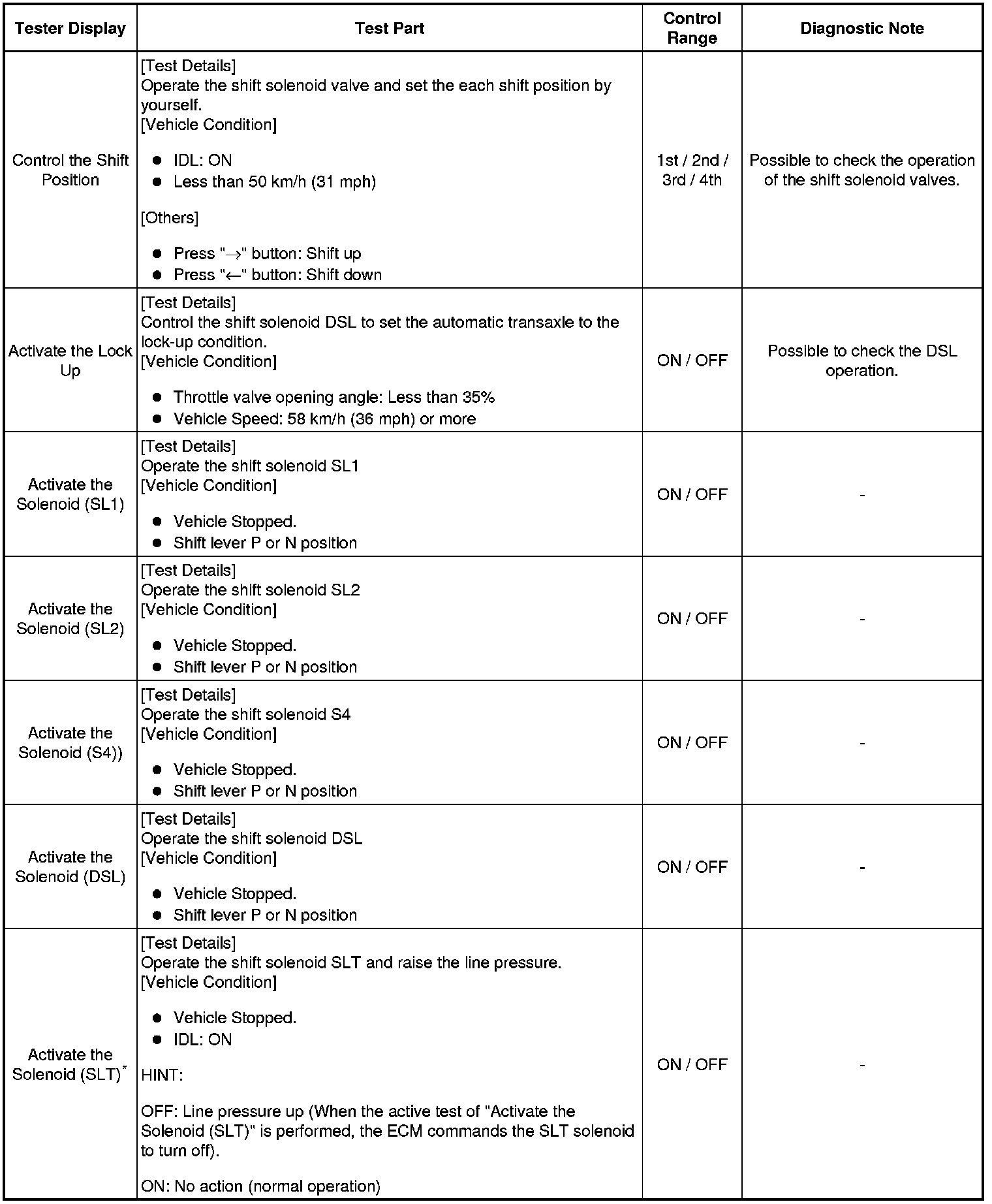 *: "Activate the Solenoid (SLT)" in the Active Test is performed to check the line pressure changes by connecting the SST to the automatic transaxle, which is used in the HYDRAULIC TEST Hydraulic Test as well.