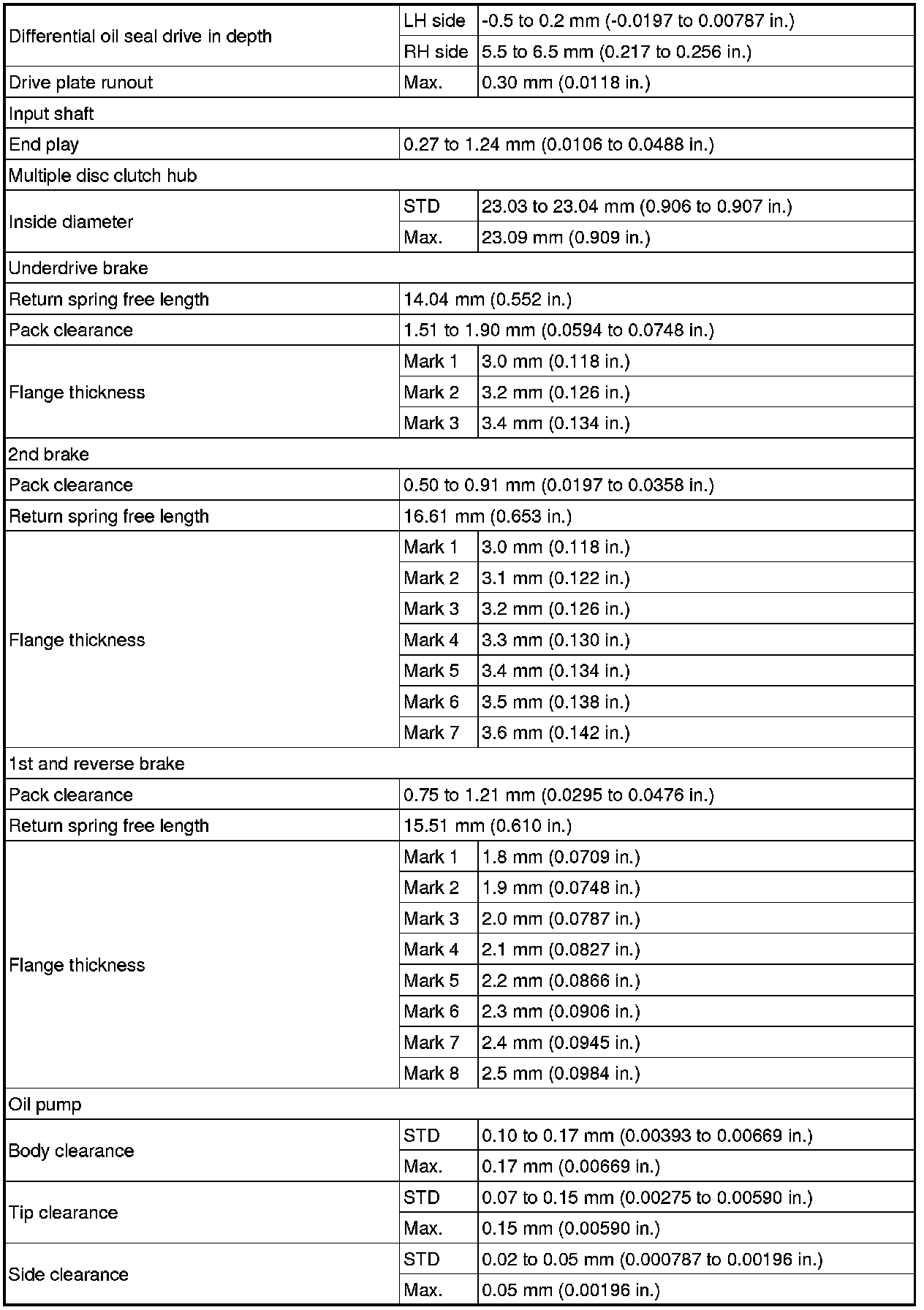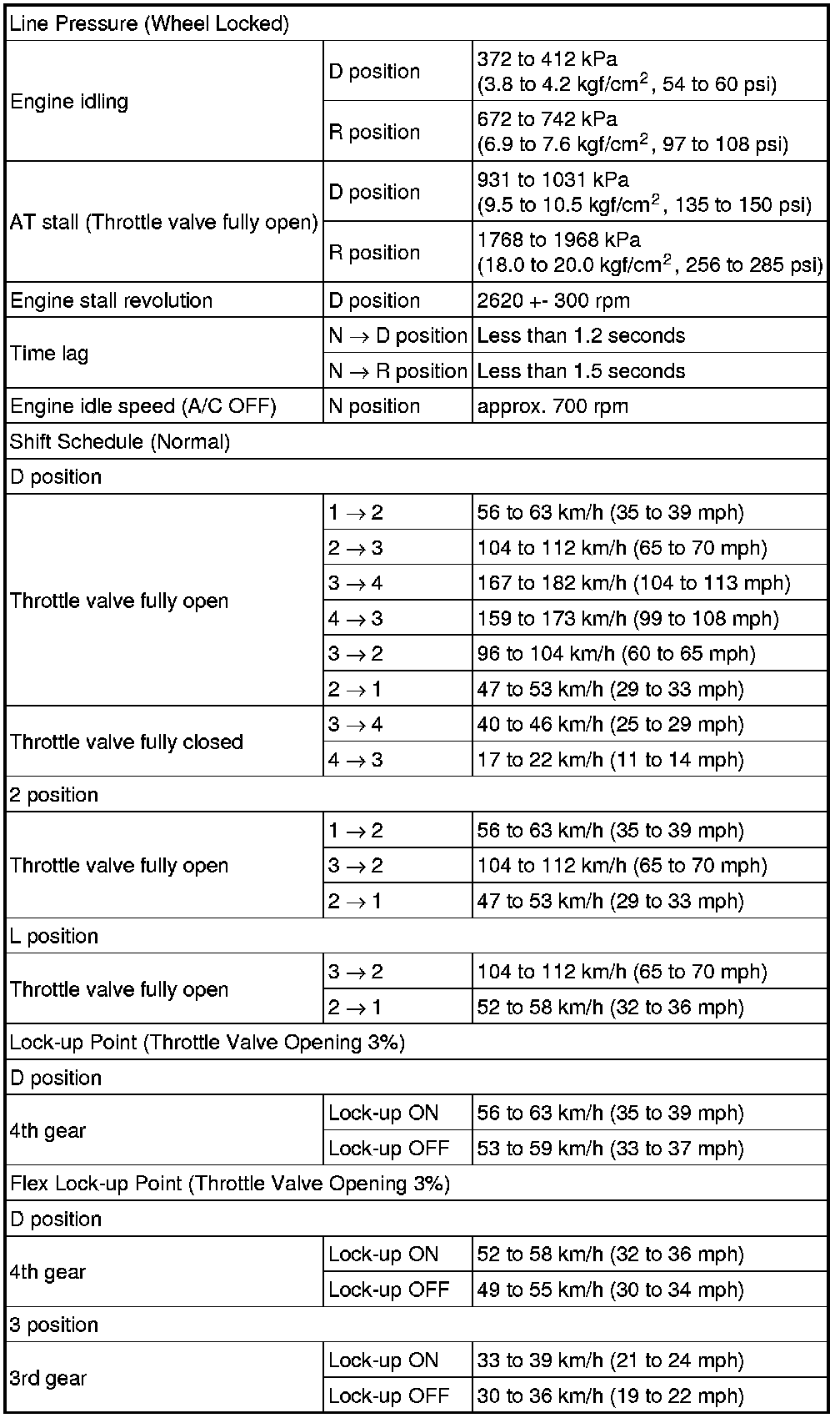 SPECIFICATIONS: U140F AUTOMATIC TRANSMISSION / TRANSAXLE: SERVICE DATA