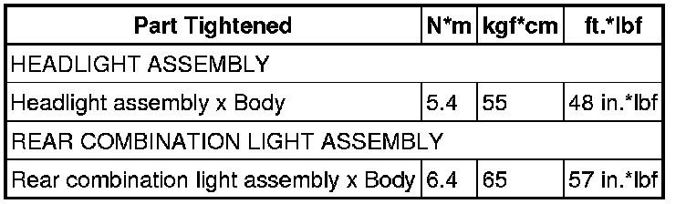 SPECIFICATIONS: LIGHTING (EXT): TORQUE SPECIFICATIONS