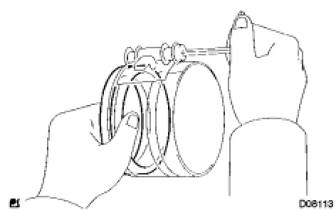 (b) Using a piston ring compressor, squeeze the snap ring.
