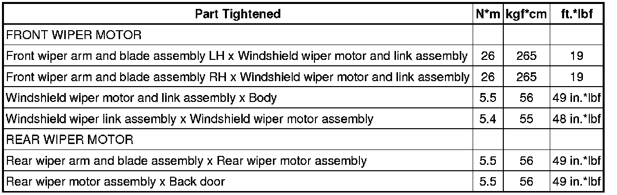 SPECIFICATIONS: WIPER / WASHER: TORQUE SPECIFICATIONS