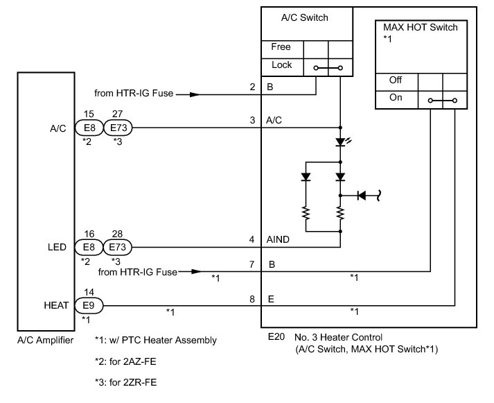 The No. 3 heater control is powered through the HTR-IG fuse. The No. 3 heater control transmits operational signals of each switch to the A/C amplifier.