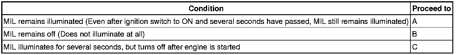 The MIL operation can be checked visually: When the ignition switch is first turned to ON, the MIL should be illuminated and should then turn off. If the MIL remains illuminated or is not illuminated, conduct the following troubleshooting procedure using the Techstream.