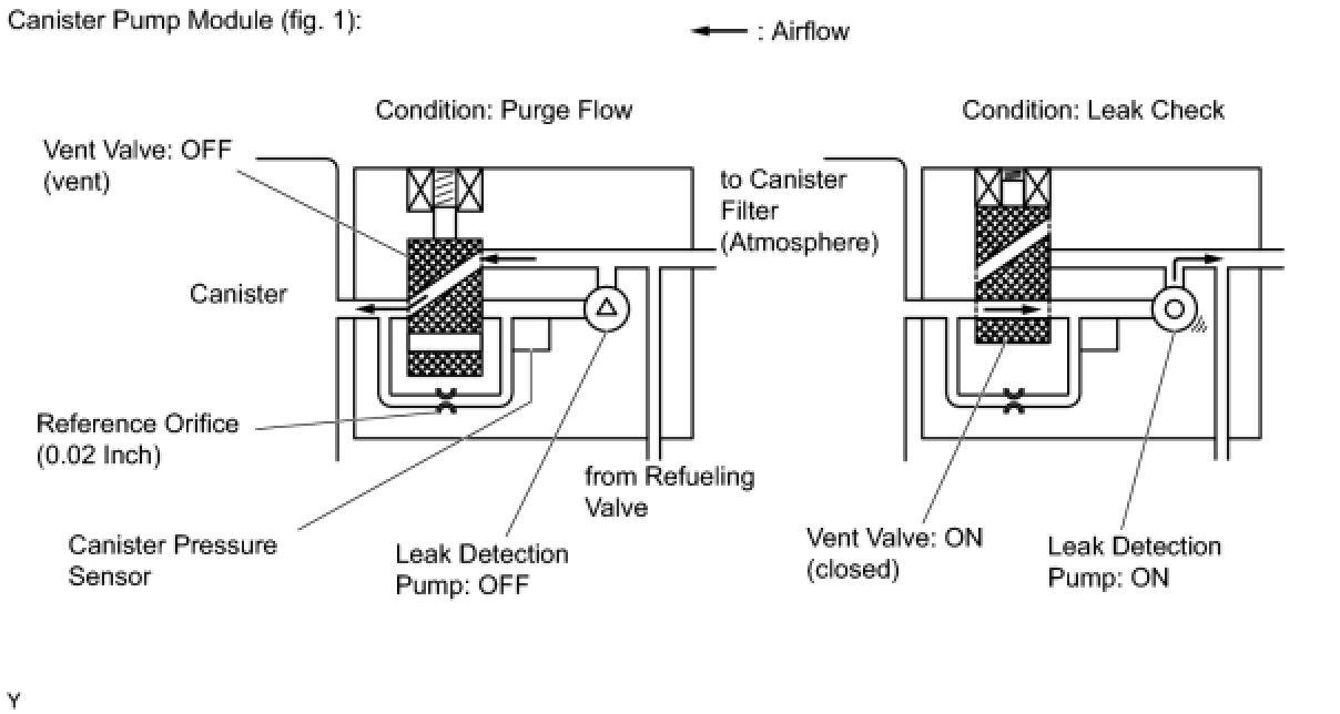 The leak detection pump creates negative pressure (vacuum) in the EVAP system and the pressure is measured. Finally, the ECM monitors for leaks from the EVAP system, and malfunctions in both the canister pump module and purge VSV, based on the EVAP pressure.