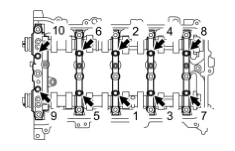 Install and tighten the 10 cylinder head bolts and 10 plate washers with a 10 mm bi-hexagon wrench in the order shown in the illustration.