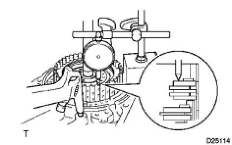 (a) Using SST and a dial indicator, measure the 1st and reverse brake clearance while pressing the discs and plates from the rear side.