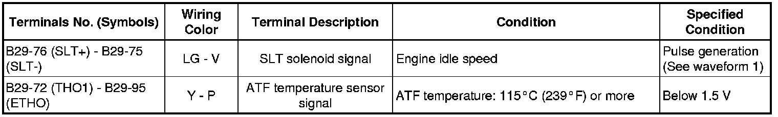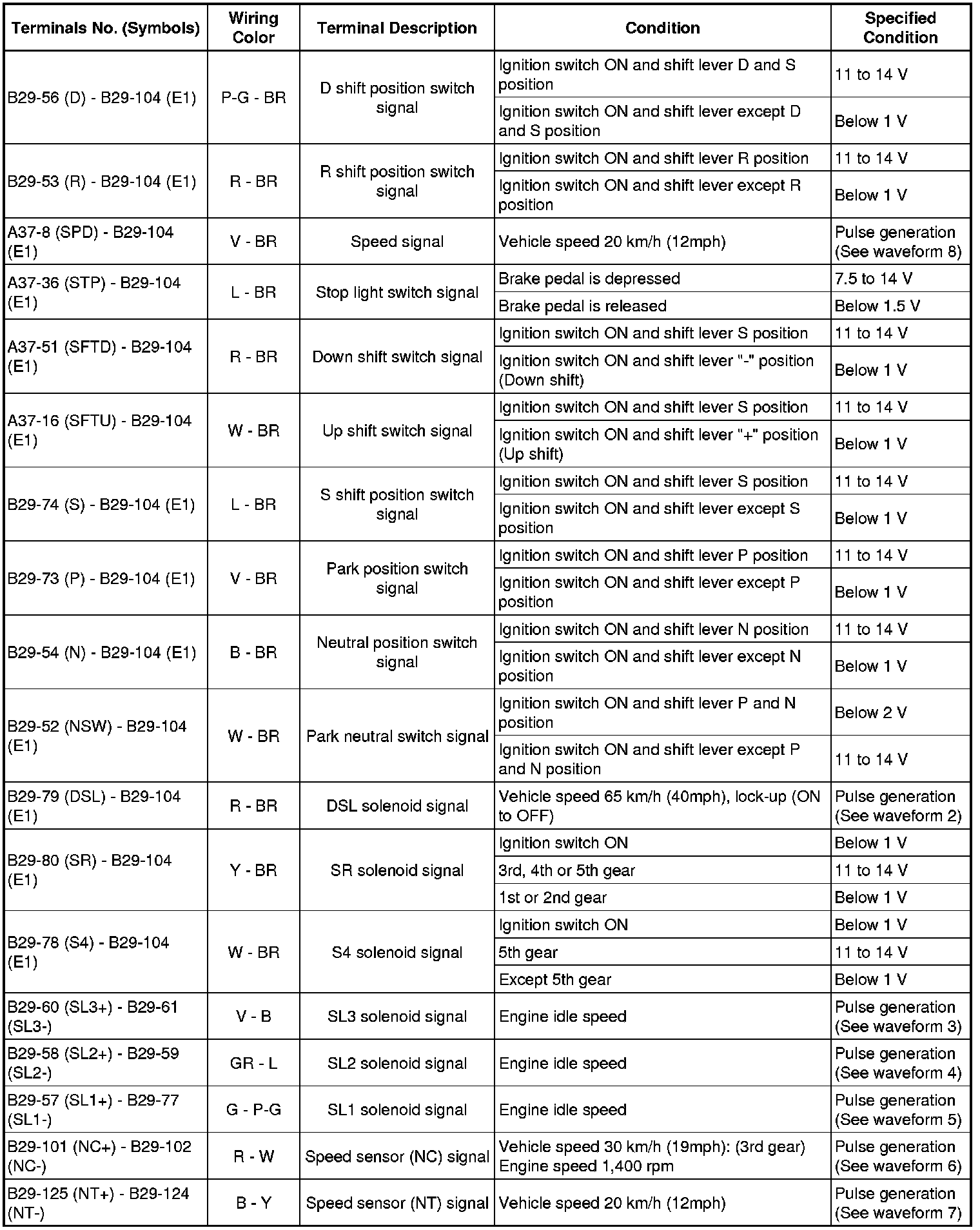 In the table, first follow the information under "Condition". Look under "Terminal No. (Symbols)" for the terminals to inspected. The standard voltage between the terminals is shown under "Specified Condition".