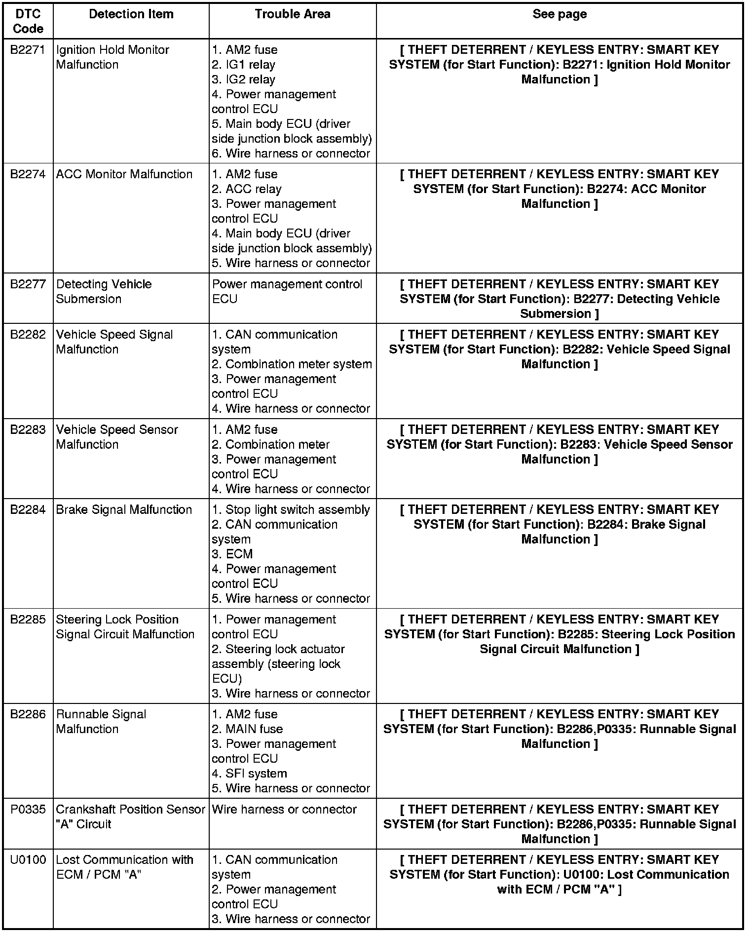 THEFT DETERRENT / KEYLESS ENTRY: SMART KEY SYSTEM (for Start Function): DIAGNOSTIC TROUBLE CODE CHART