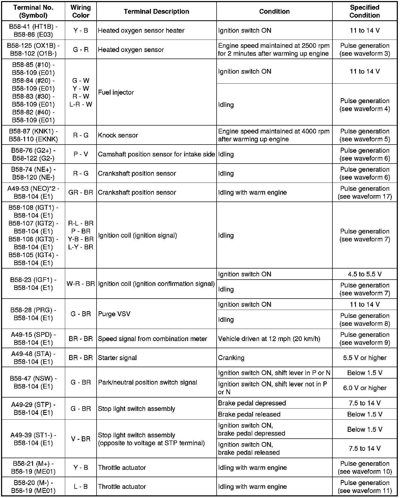 The standard voltage between each pair of ECM terminals is shown in the table below. The appropriate conditions for checking each pair of terminals are also indicated. The result of checks should be compared with the standard voltage for that pair of terminals, displayed in the Specified Condition column. The illustration above can be used as a reference to identify the ECM terminal locations.
