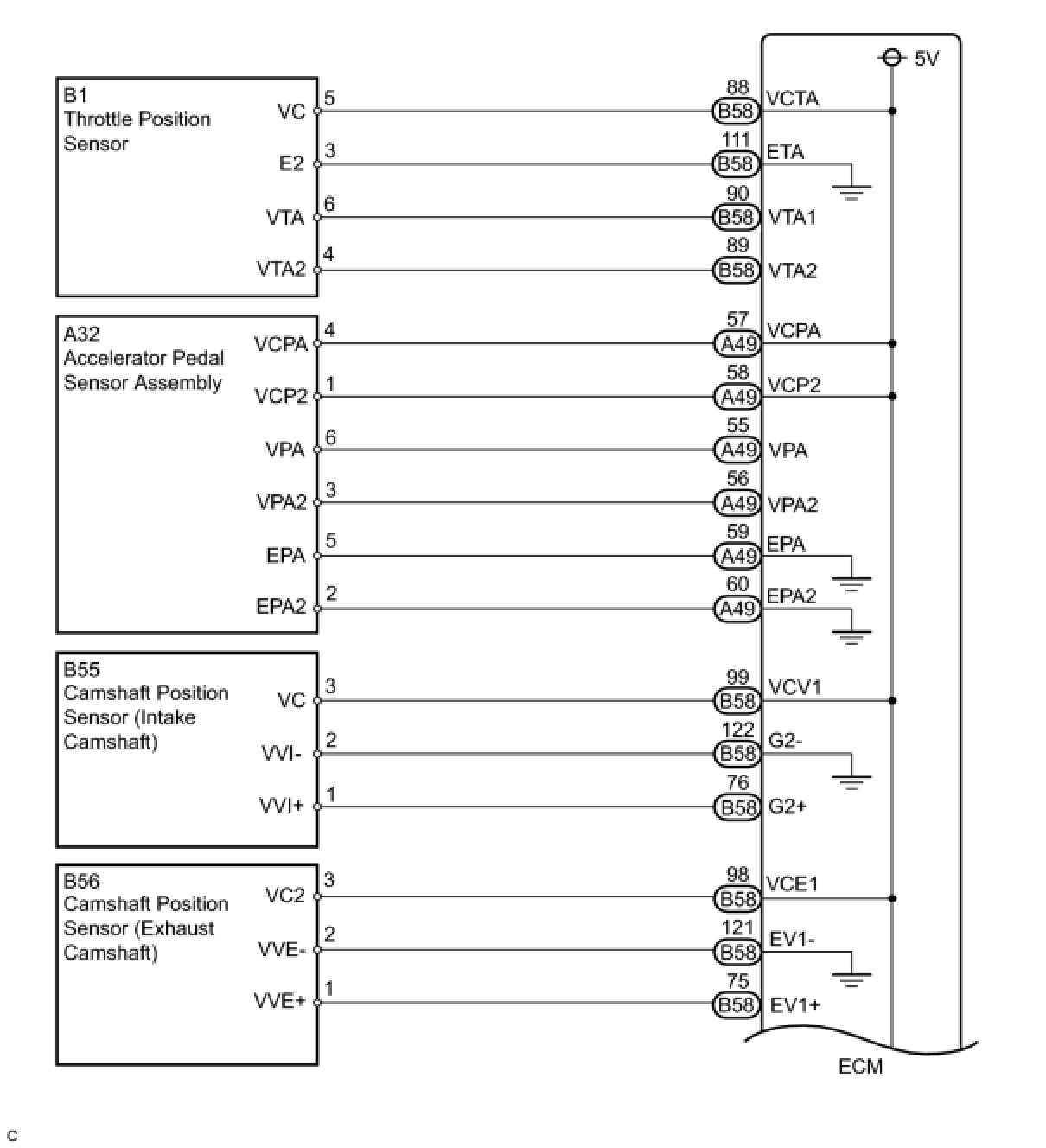 The ECM constantly generates 5 V of power from battery voltage supplied to the +B (BATT) terminal to operate the microprocessor. The ECM also provides this power to the sensors through the VC output circuit.