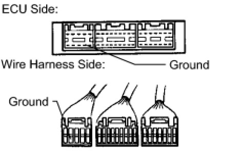 (2) Disconnect the ECU connector. Check the ground terminals on the ECU side and wire harness side for bent terminals, corrosion or foreign matter. Lastly, check the contact pressure of the female terminals.