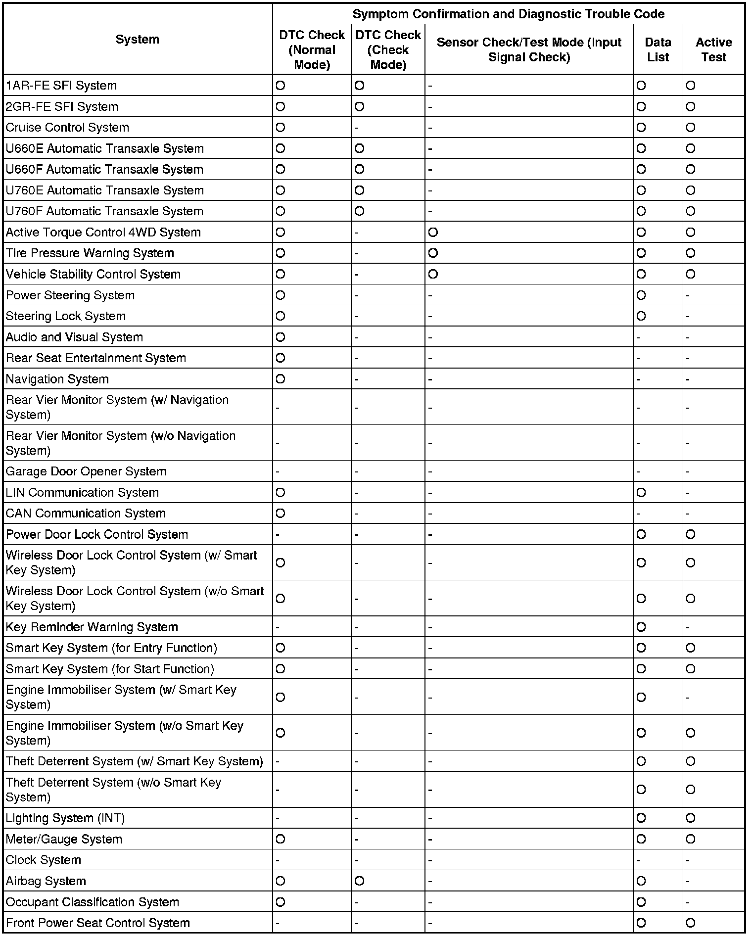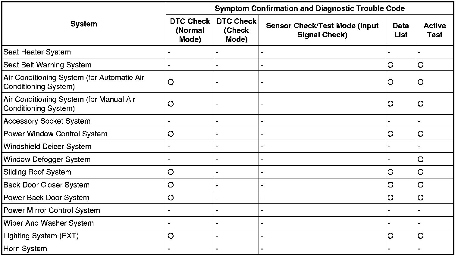By using these functions, the problem areas can be narrowed down and troubleshooting can be more effective. Diagnostic functions are incorporated in the following systems of this vehicle.