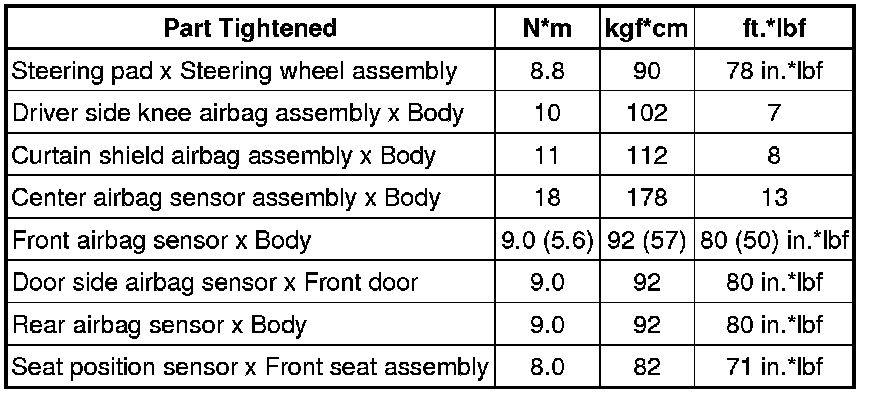 SPECIFICATIONS: SUPPLEMENTAL RESTRAINT SYSTEMS: TORQUE SPECIFICATIONS
