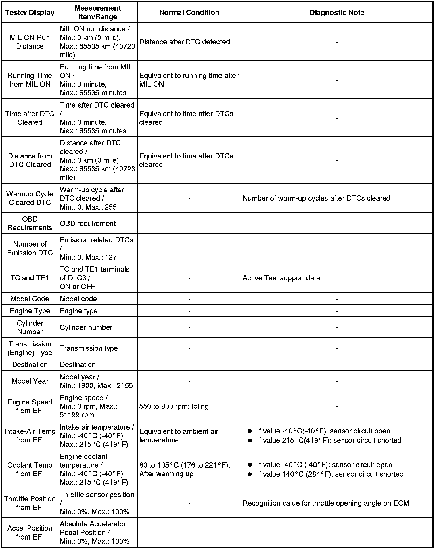 In the table below, the values listed under "Normal Condition" are reference values. Do not depend solely on these reference values when deciding whether a part is faulty or not.