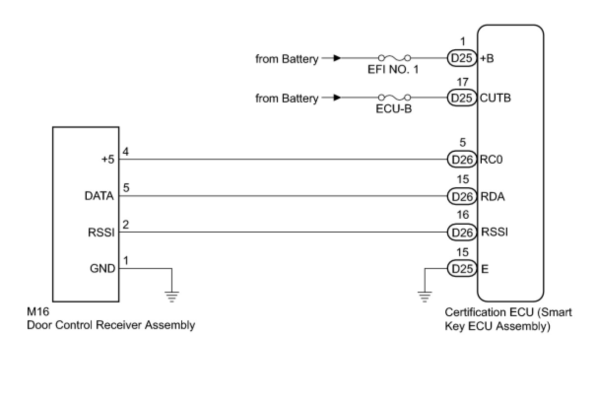 When the entry door lock and unlock functions and wireless door lock and unlock functions do not operate, radio wave interference, or a malfunction in the key or signal circuit between the door control receiver assembly and certification ECU (smart key ECU assembly) is suspected. The signal circuit is shared by the entry function and wireless door lock function.
