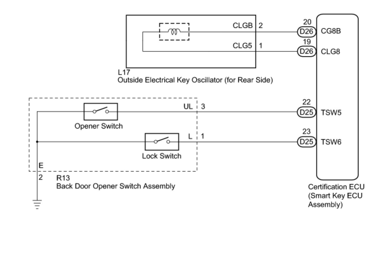 When the back door entry lock and unlock functions do not operate, one of the following may be malfunctioning: 1) power door lock control system; 2) outside electrical key oscillator (for rear side); 3) certification ECU (smart key ECU assembly), or 4) back door opener switch assembly.
