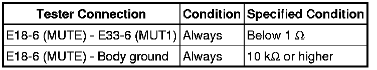 The MUTE signal is sent to reduce noise and a popping sound generated when switching the mode etc. If there is an open in the circuit, noise can be heard from the speakers when changing the sound source. If there is a short in the circuit, even though the navigation receiver assembly is functioning normally, no sound or only an extremely faint sound can be heard.