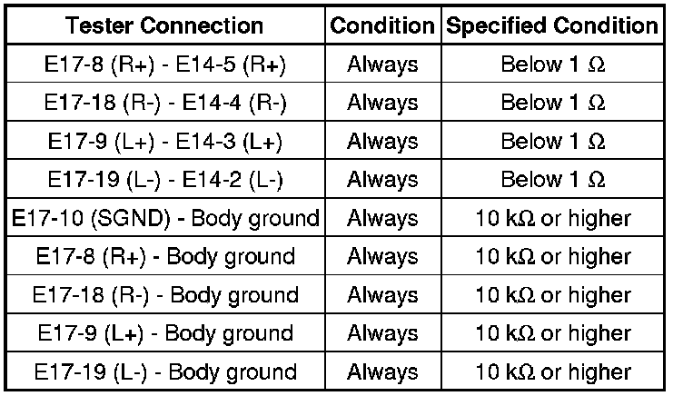 If there is an open or short in the circuit, sound cannot be heard from the speakers even if there is no malfunction in the stereo component amplifier or speakers.