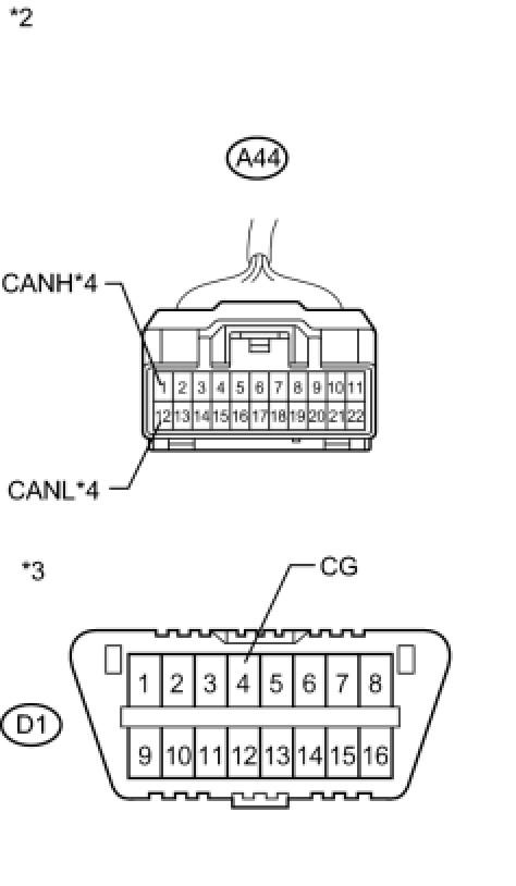 There may be a short circuit between the CAN bus main wire and GND when there is no resistance between terminals 6 (CANH) and 4 (CG) or 14 (CANL) and 4 (CG) of the DLC3.
