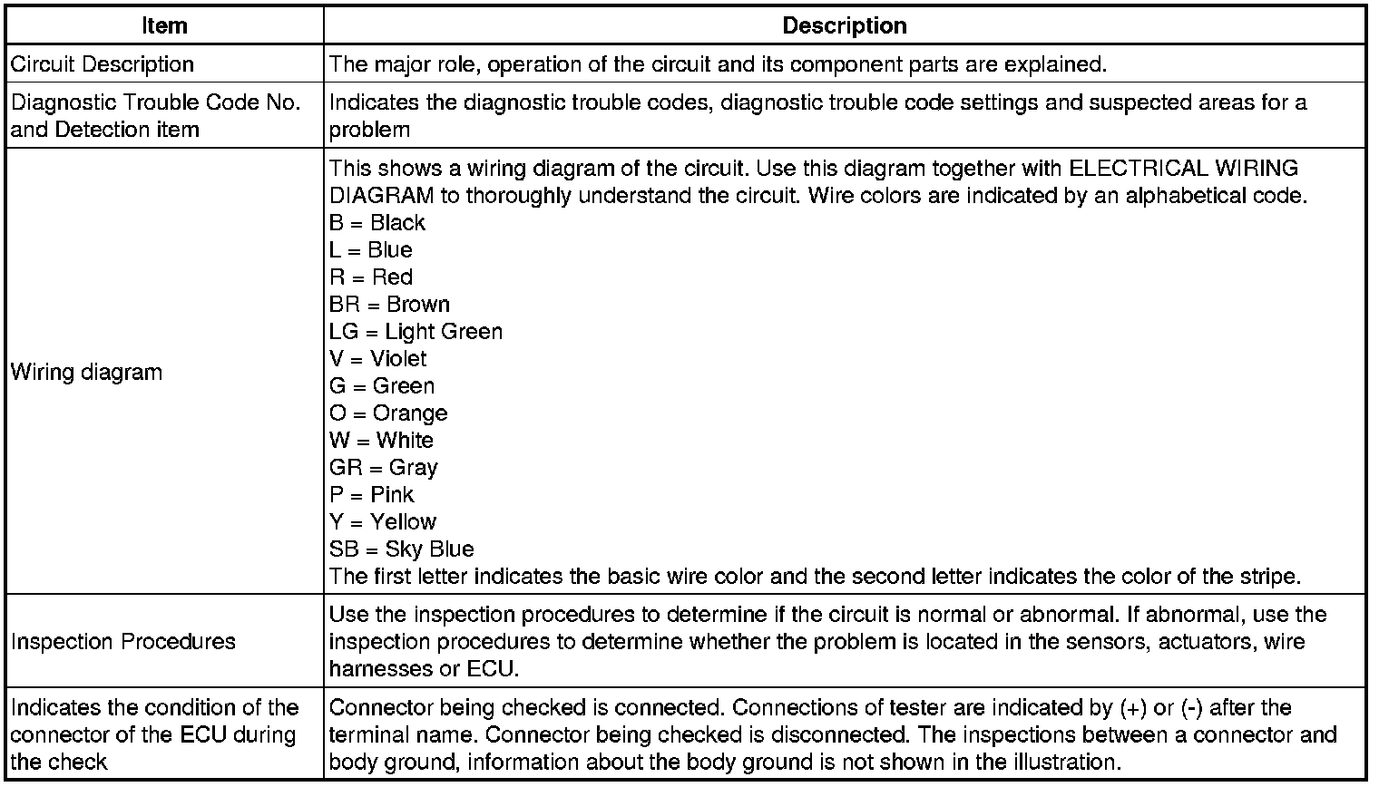 When a "Normal" code is output during a DTC check but the problem is still occurring, use the Problem Symptoms Table. The suspected areas (circuits or parts) for each problem symptoms are in the table. The suspected areas are listed in order of probability. A description of each of the chart's columns are below.