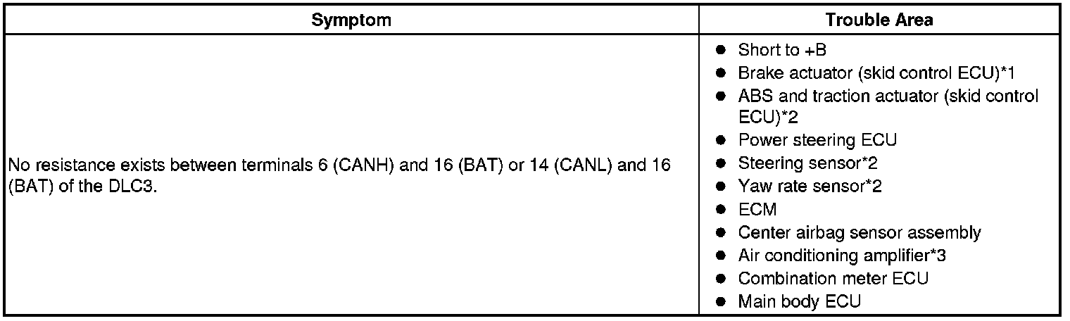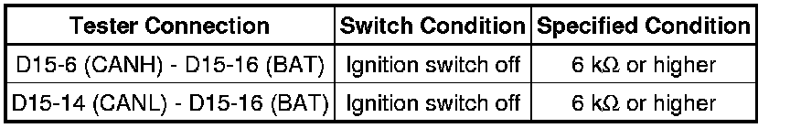 There may be a short circuit between the CAN bus line and +B when no resistance exists between terminals 6 (CANH) and 16 (BAT) or terminals 14 (CANL) and 16 (BAT) of the DLC3.