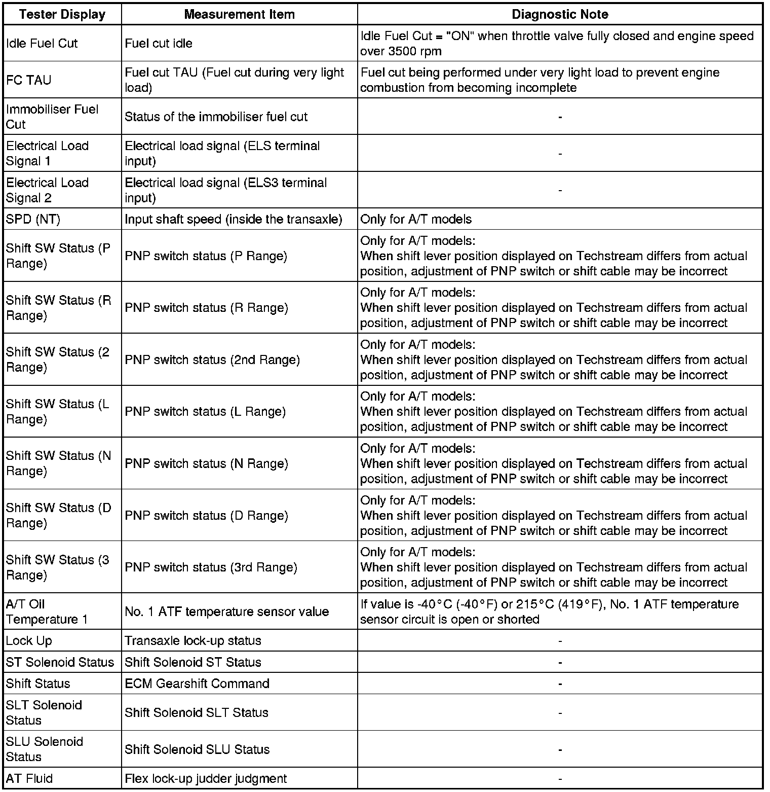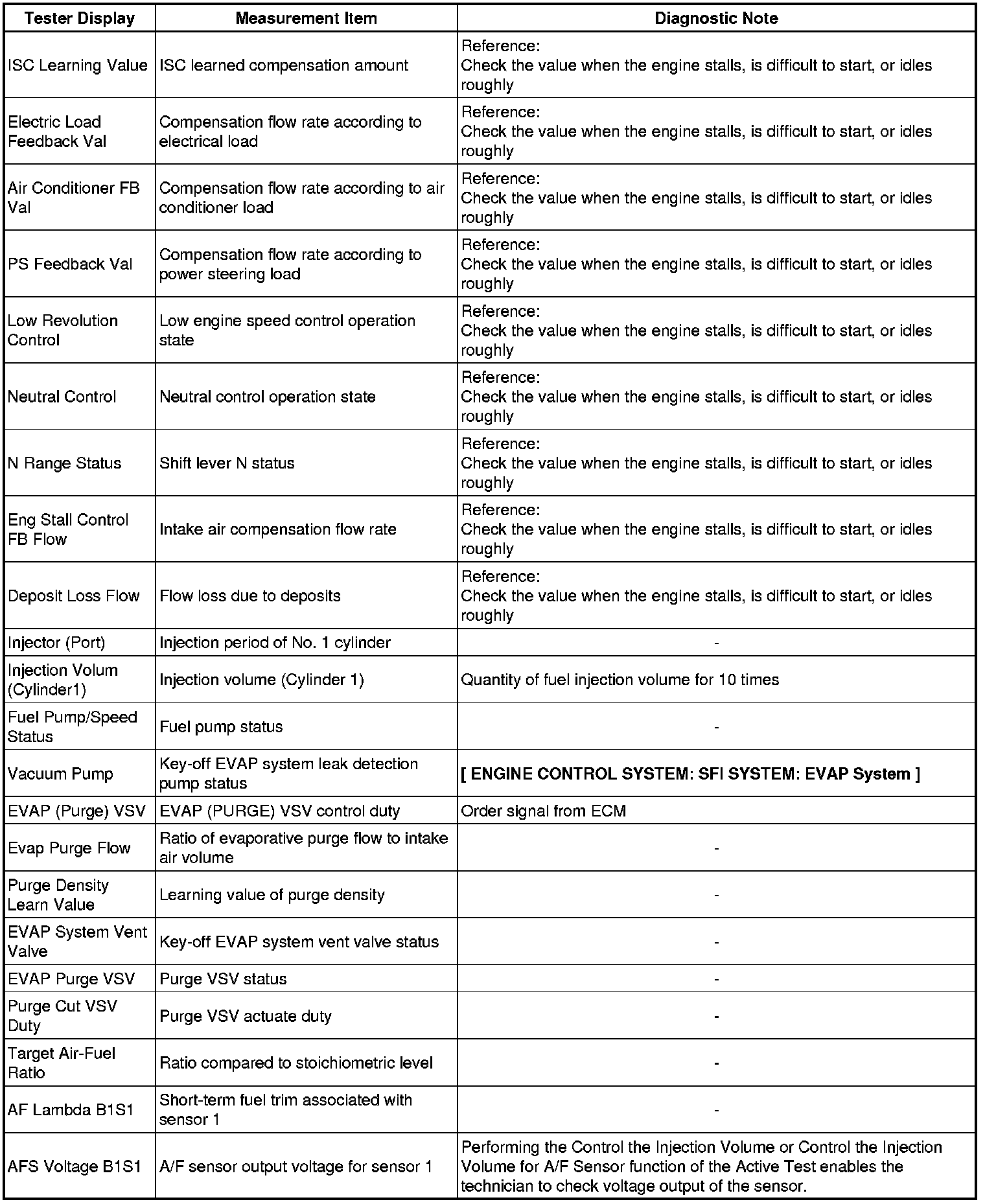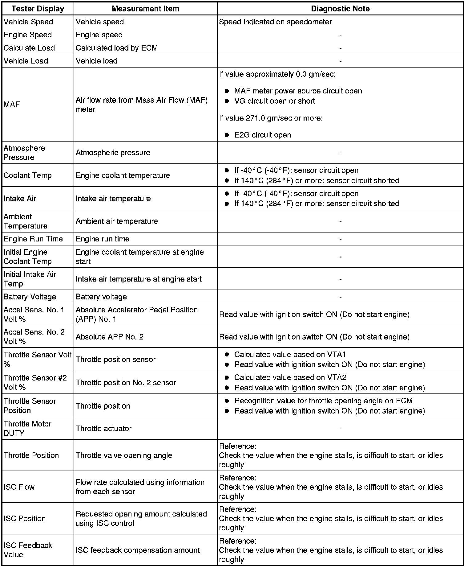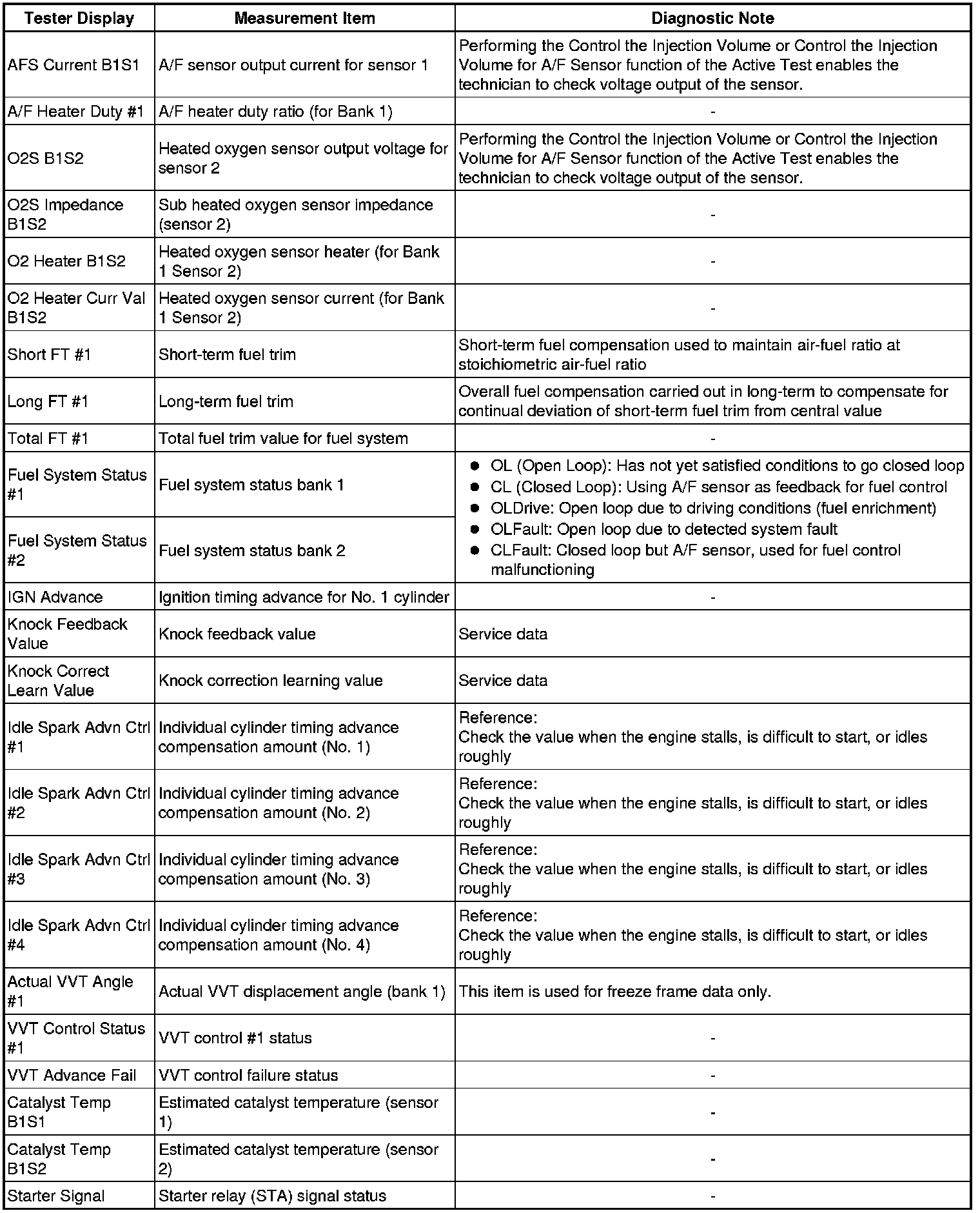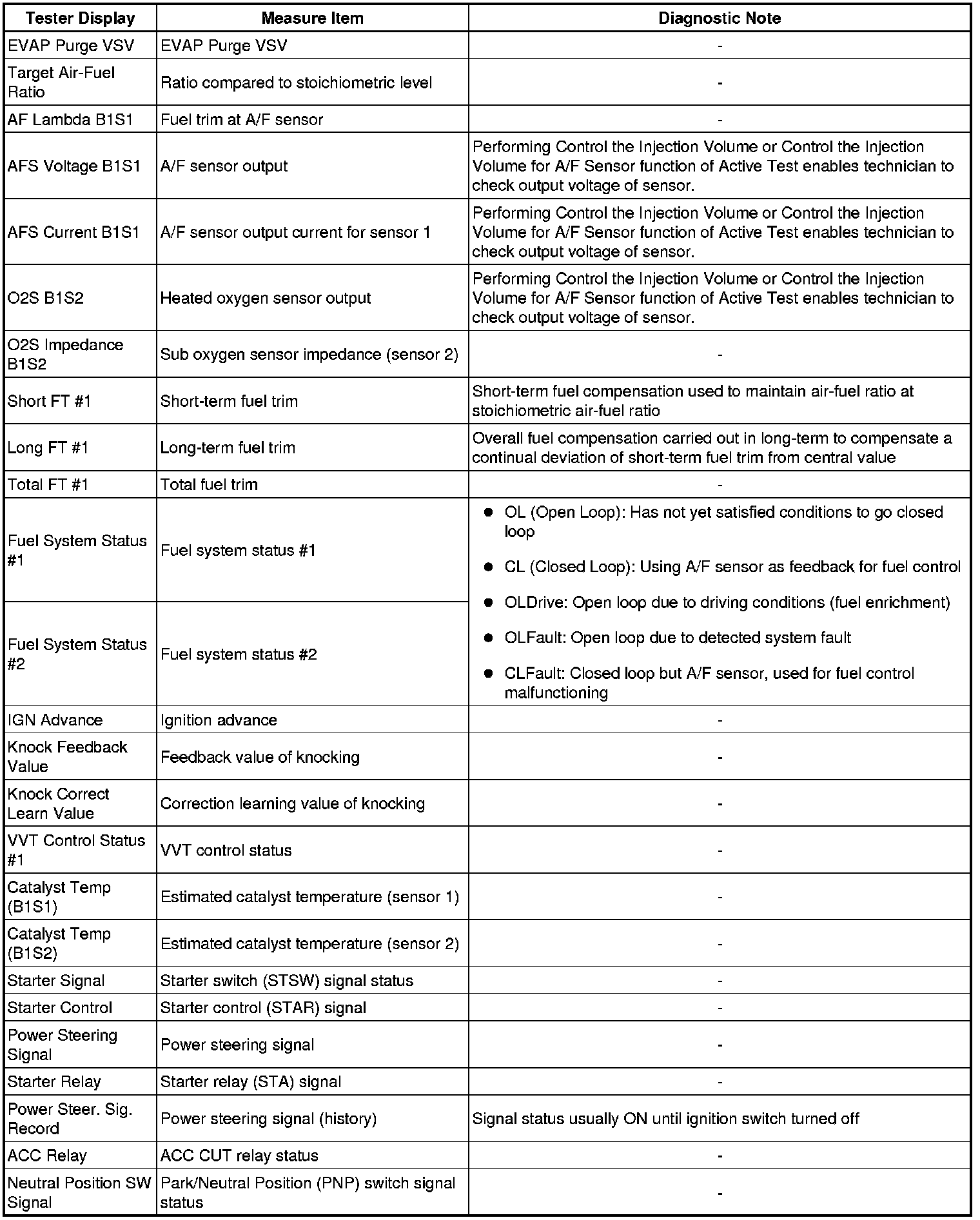 Freeze frame data records the engine conditions (fuel system, calculated load, engine coolant temperature, fuel trim, engine speed, vehicle speed, etc.) when a malfunction is detected. When troubleshooting, it can help determine if the vehicle was running or stopped, the engine was warmed up or not, the air-fuel ratio was Lean or Rich, and other data, from the time the malfunction occurred.