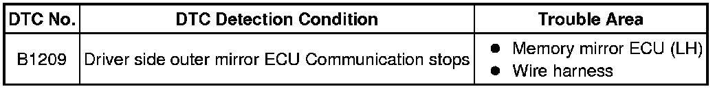 * This DTC is detected when communication between the driver side outer mirror ECU (memory mirror ECU) and gateway ECU stops for more than 10 seconds.