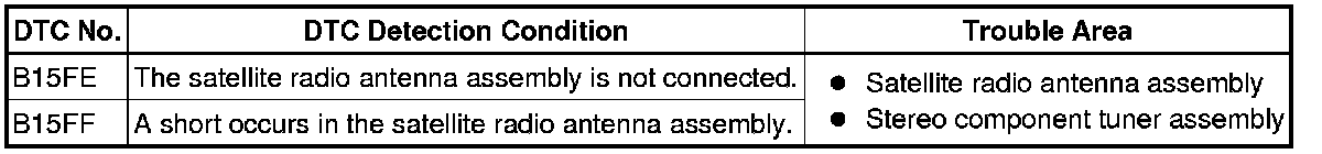 These DTCs are stored when a malfunction occurs in the satellite radio antenna assembly which is connected to the stereo component tuner assembly.