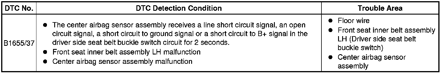 DTC B1655/37 is recorded when a malfunction is detected in the driver side seat belt buckle switch circuit.