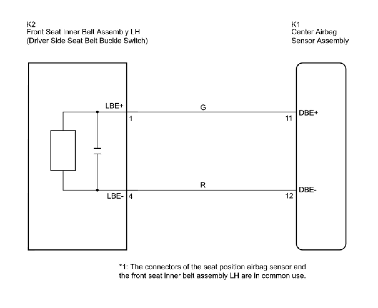 The driver side seat belt buckle switch circuit consists of the center airbag sensor assembly and the front seat inner belt assembly LH.