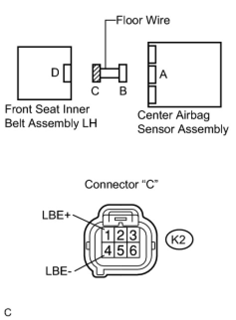 (c) Check that the connectors are properly connected to the center airbag sensor assembly and the front seat inner belt assembly LH.