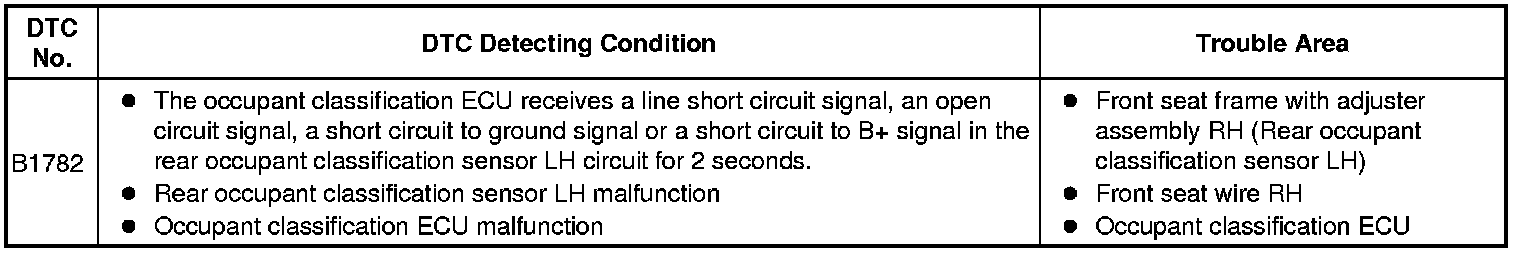 DTC B1782 is recorded when a malfunction is detected in the rear occupant classification sensor LH circuit.