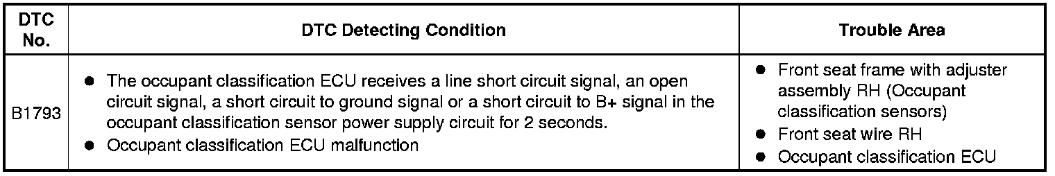 DTC B1793 is recorded when a malfunction is detected in the occupant classification sensor power supply circuit.