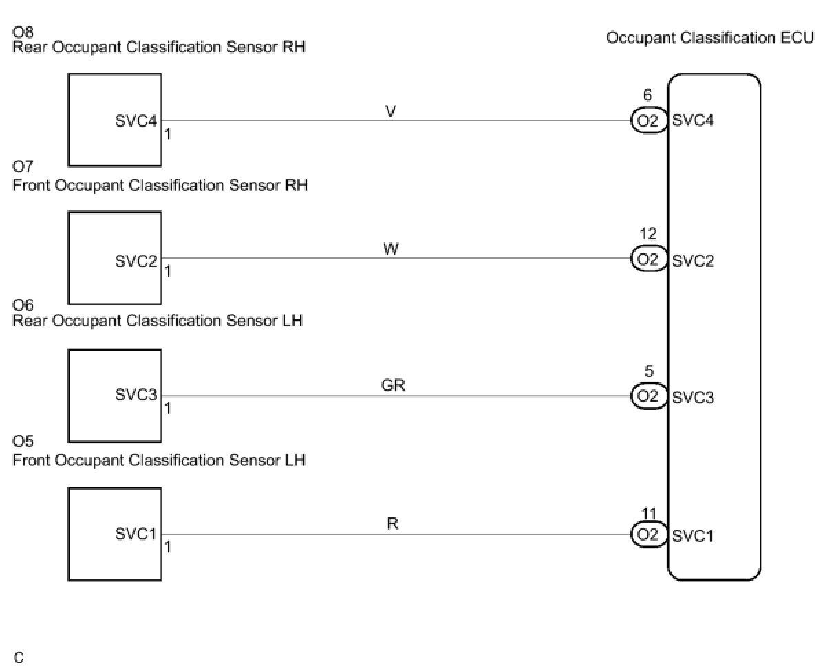 The occupant classification sensor power supply circuit consists of the occupant classification ECU and the occupant classification sensors.