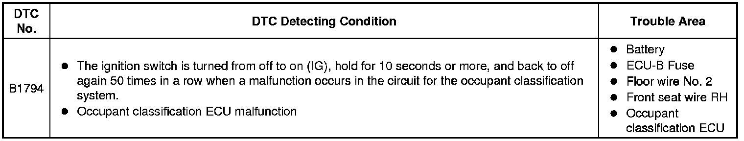 DTC B1794 is recorded when a malfunction is detected in the occupant classification ECU or the power source circuit.