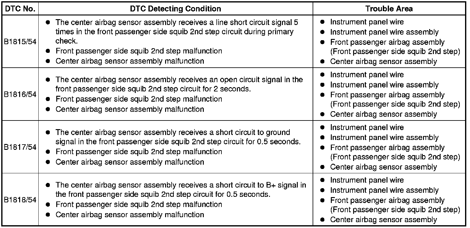 These DTCs are recorded when a malfunction is detected in the front passenger side squib 2nd step circuit.