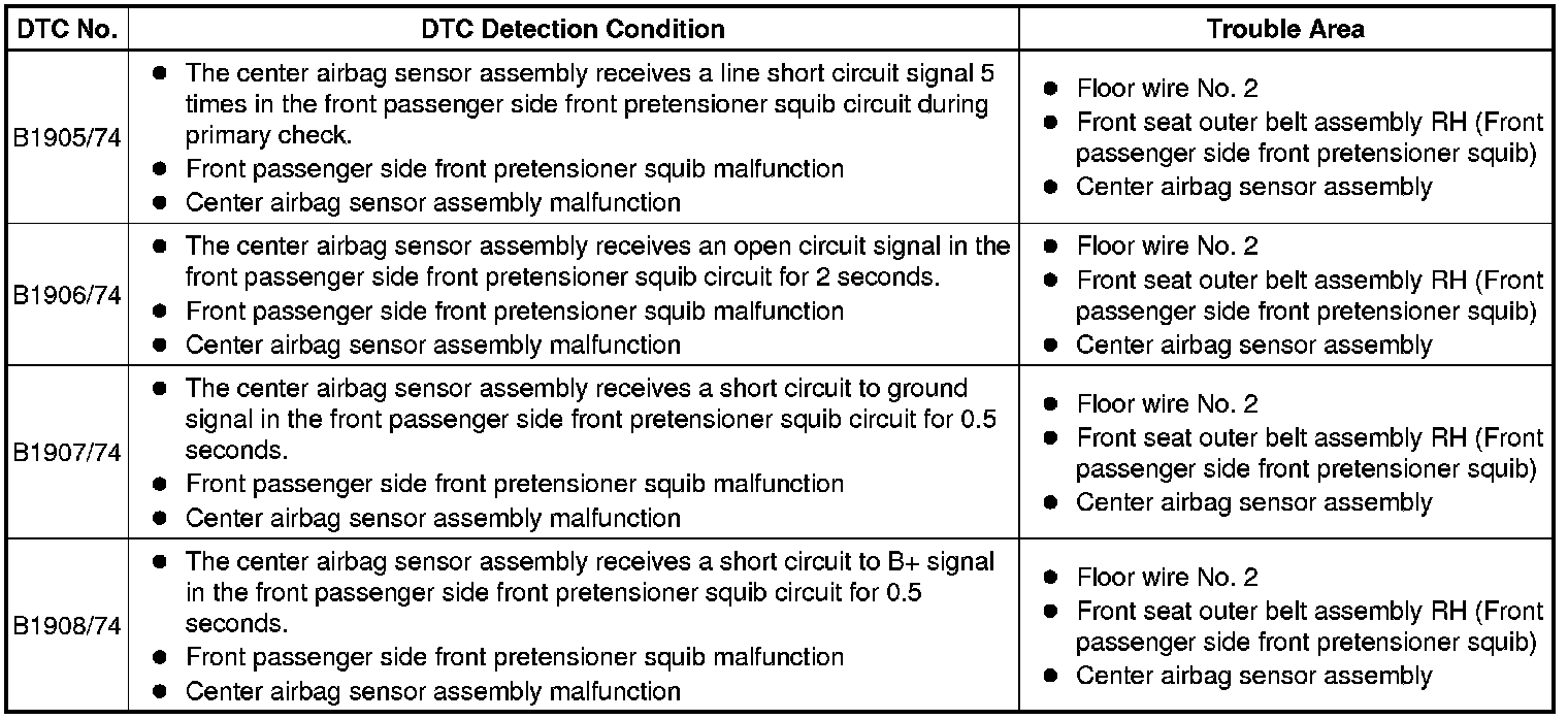 SUPPLEMENTAL RESTRAINT SYSTEM: AIRBAG SYSTEM: B1905/74-B1908/74: Short in Front Passenger Side Pretensioner Squib Circuit