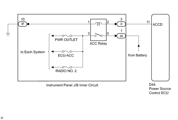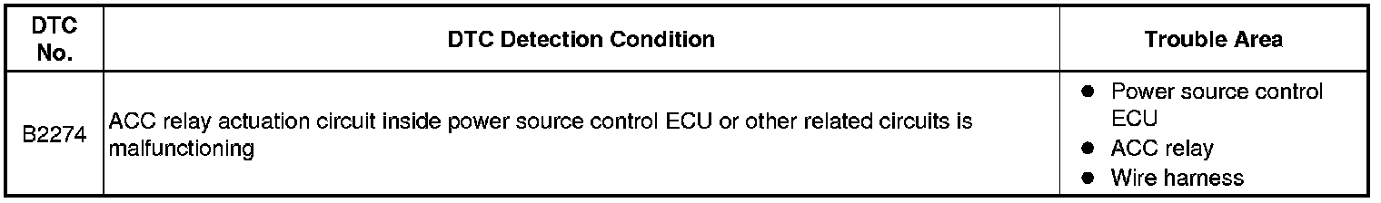 This DTC is output when the ACC output circuit from the inside the power source control ECU to the ACC relay is malfunctioning.