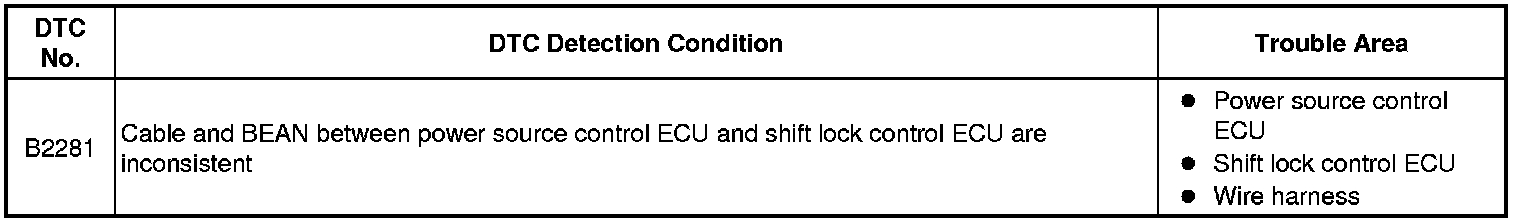 The power source control ECU and the shift lock control ECU are connected by a cable and the BEAN. If the cable information and BEAN information are inconsistent, this DTC will be output.