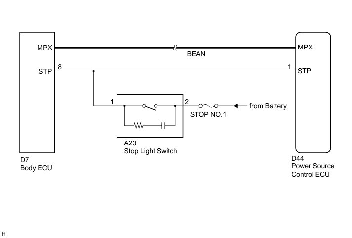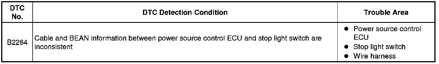 This DTC is output when :1) the brake signal circuit between the power source control ECU and the stop light switch is malfunctioning; and 2) the cable and BEAN information are inconsistent.