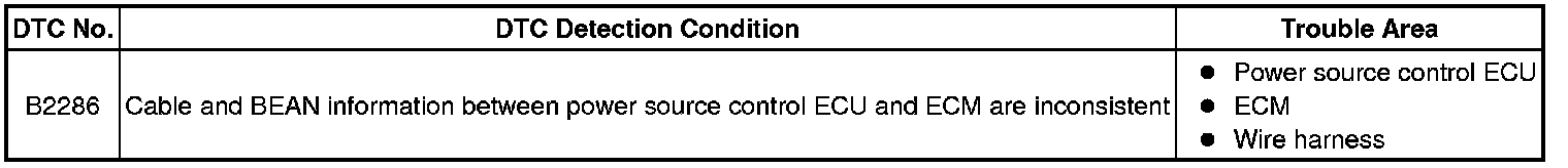 The power source control ECU and the ECM are connected by the cable and BEAN. If the cable information and BEAN information are inconsistent, this DTC will be output.
