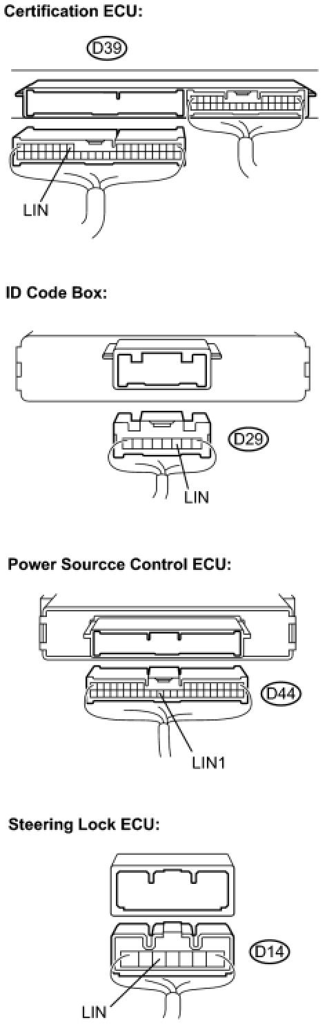 The smart key system uses the LIN communication line for communication. LIN communication sends and receives signals by serial communication, and connects with CAN and multiplex communication via the gateway ECU.