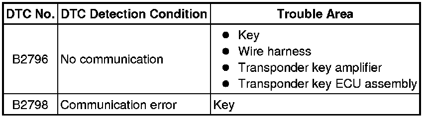 This DTC is output when a key that does not have a transponder chip is inserted into the ignition key cylinder or if communication between the key and transponder key ECU assembly is not possible.