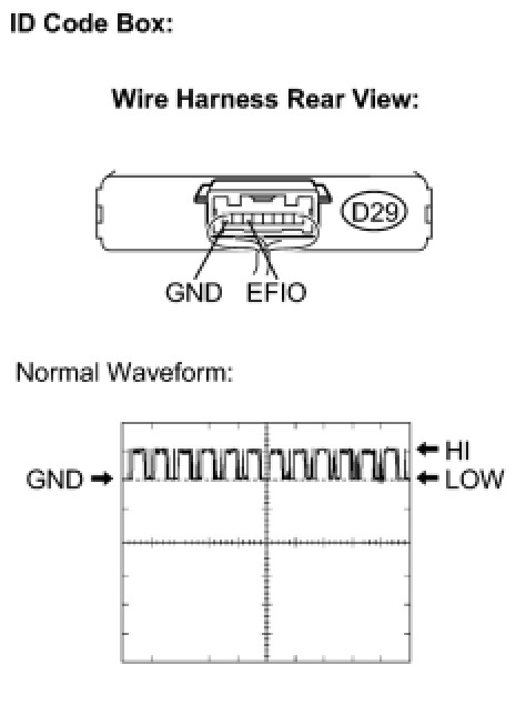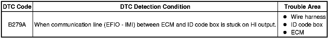 If the communication line (EFIO - IMI) to the ID code box is stuck on HI output, the ECM stores this DTC.