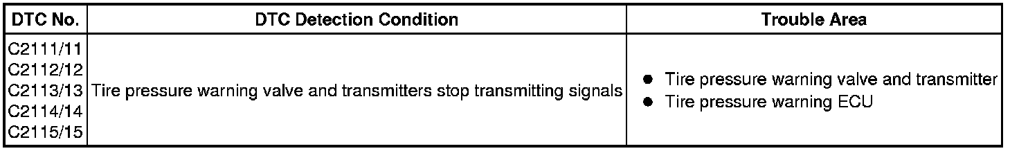 The tire pressure warning valve and transmitters that are installed in the tire and wheel assemblies measure the air pressure of the tires. The measured values are transmitted to the tire pressure warning antenna and receiver on the body as radio waves and then sent to the tire pressure warning ECU. The ECU compares the measured air pressure values with the air pressure threshold. When the measured air pressure value is less than this threshold, the warning light in the combination meter comes on. The tire pressure warning ECU stores a DTC when the tire pressure warning valve and transmitter stops transmitting signals. At this time, forcibly transmit the signals by releasing the tire pressure rapidly. The stored DTC is cleared when the signal transmission is resumed.