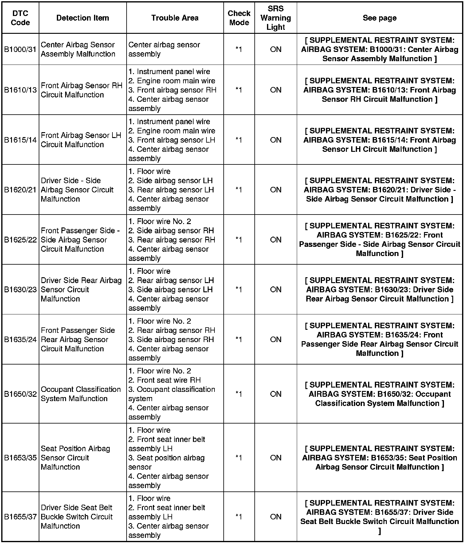 SUPPLEMENTAL RESTRAINT SYSTEM: AIRBAG SYSTEM: DIAGNOSTIC TROUBLE CODE CHART