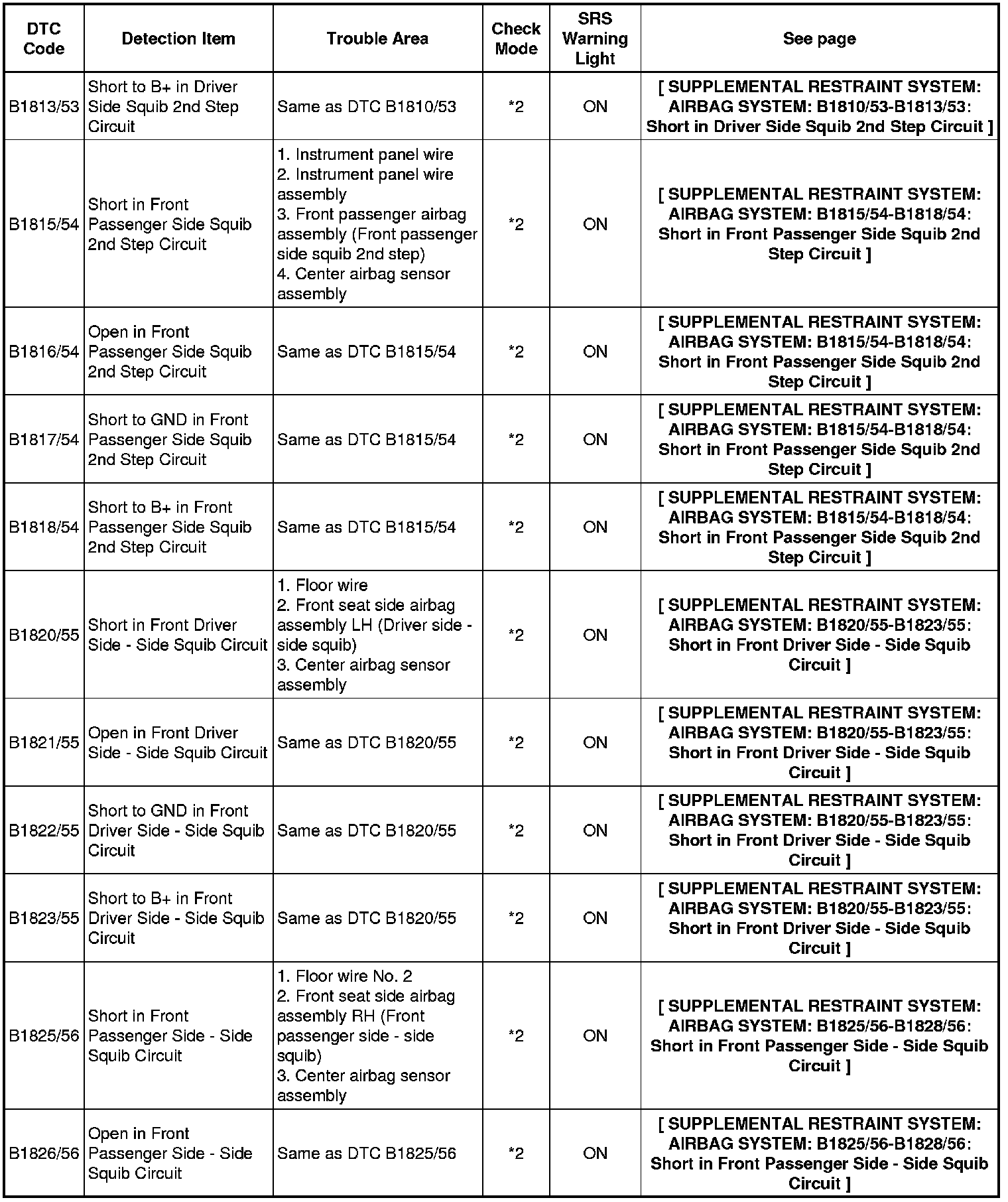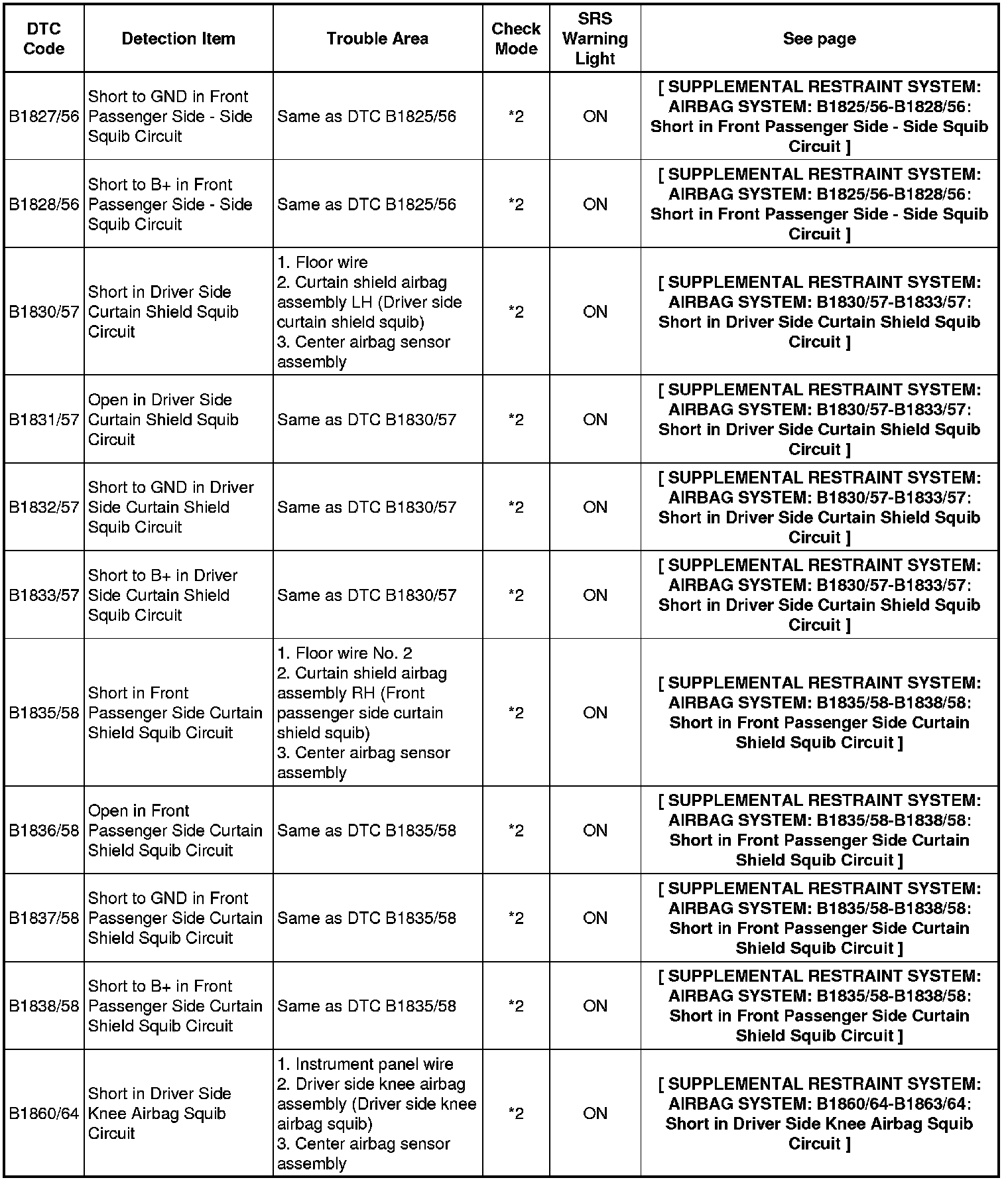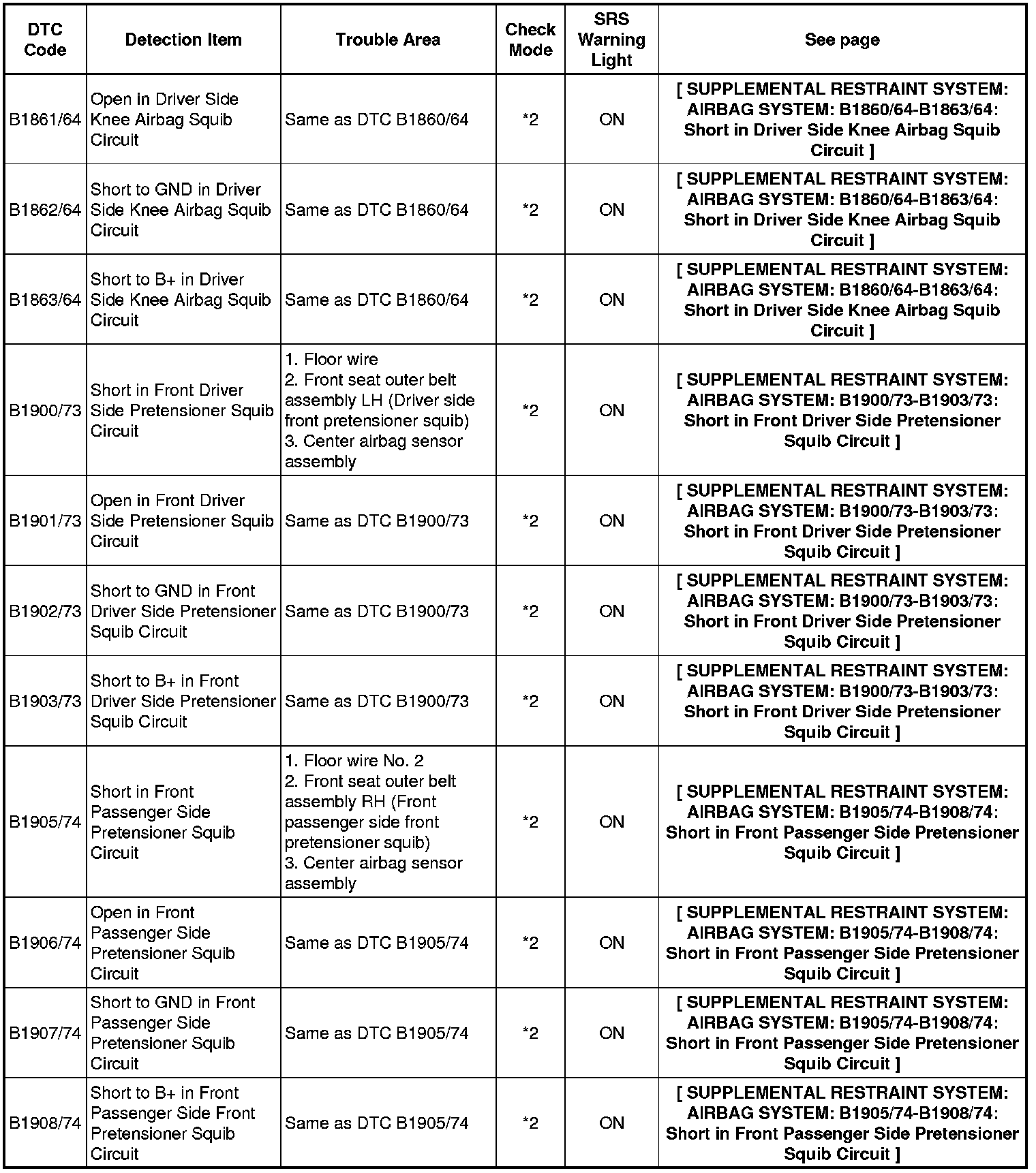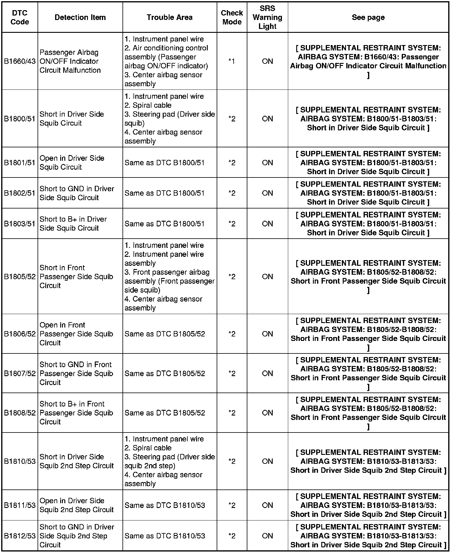 * In the case of any malfunction concerning an open circuit, short to ground, or short to B+ due to a squib, other trouble codes may not be detected. In this case, repair the malfunction currently indicated and then perform malfunction diagnosis again.