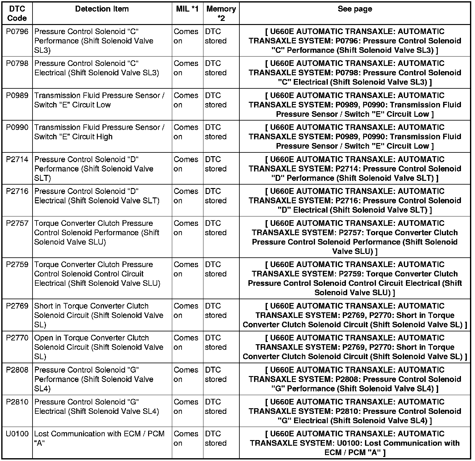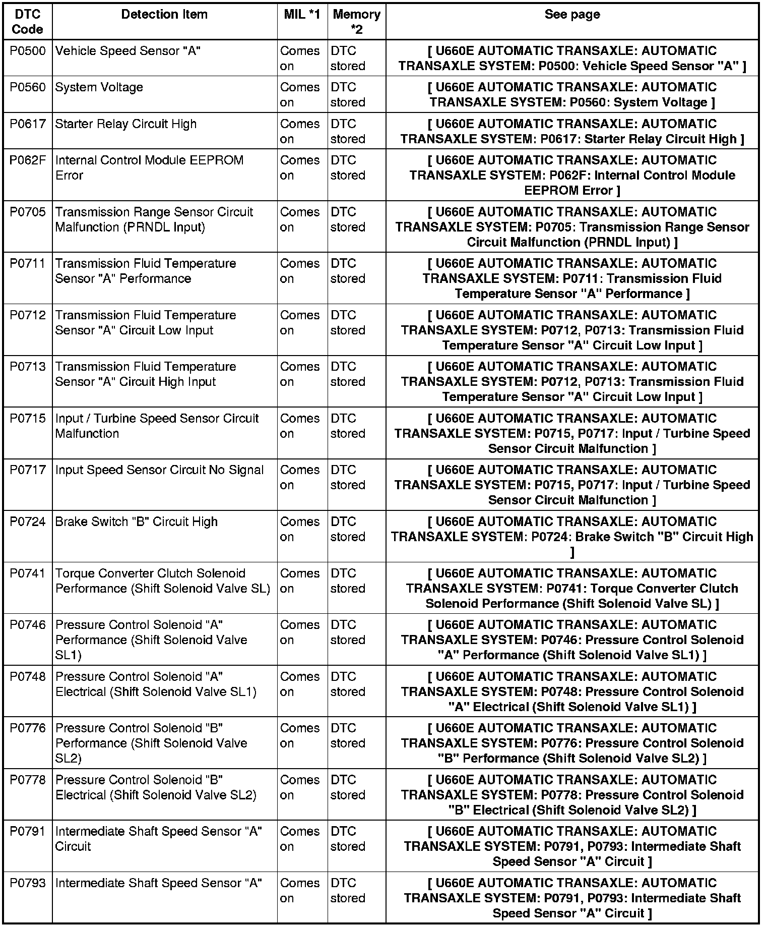 U660E AUTOMATIC TRANSAXLE: AUTOMATIC TRANSAXLE SYSTEM: DIAGNOSTIC TROUBLE CODE CHART