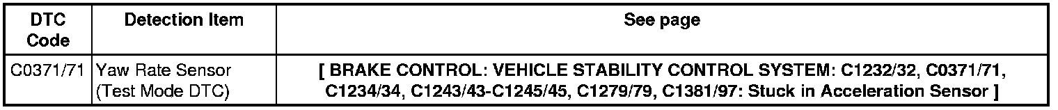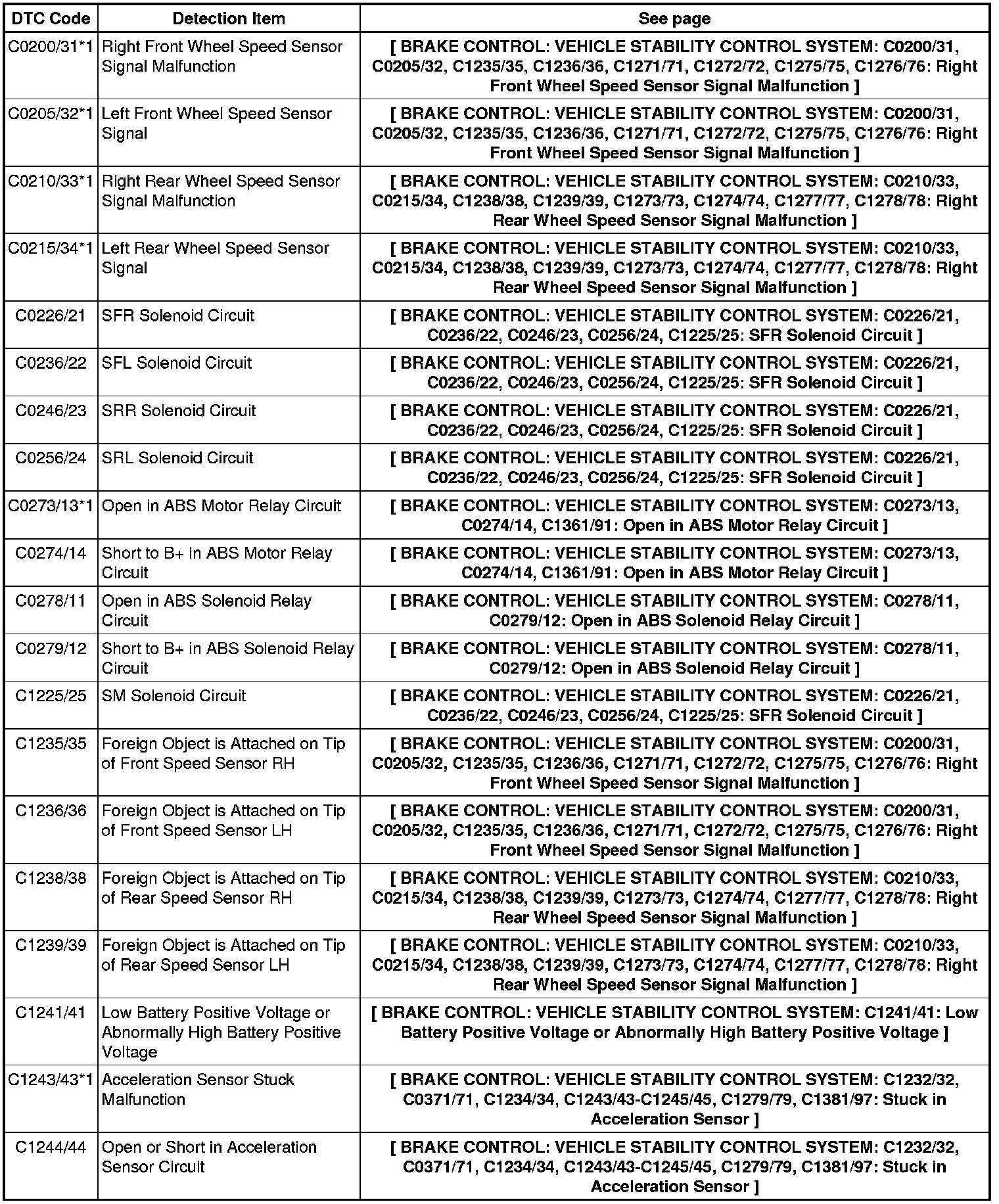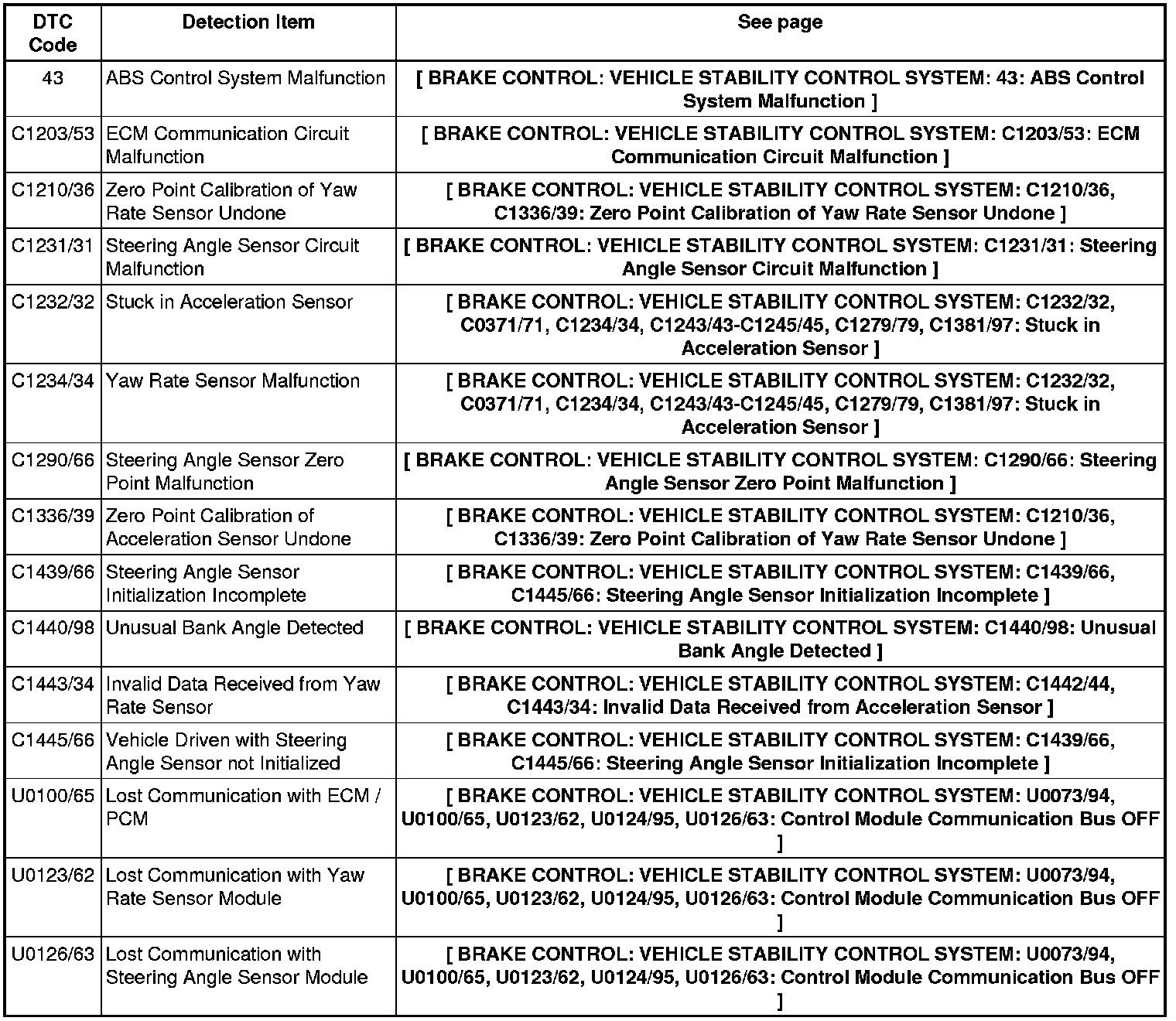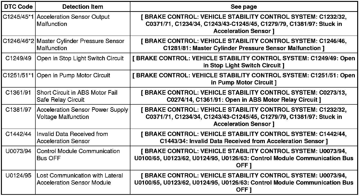 BRAKE CONTROL: VEHICLE STABILITY CONTROL SYSTEM: DIAGNOSTIC TROUBLE CODE CHART
