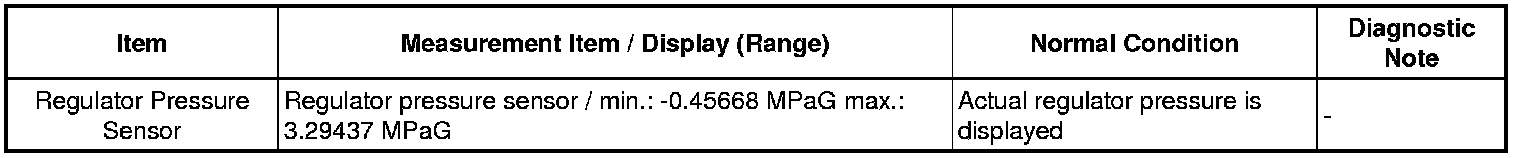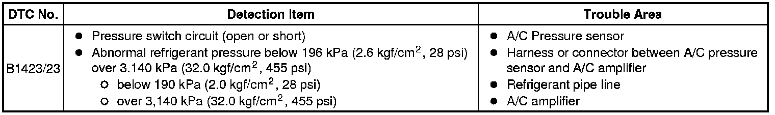 This DTC is output when refrigerant pressure is extremely low (0.19 MPa (2.0 kgf/cm2, 28 psi) or less) or extremely high (3.14 MPa (32.0 kgf/cm2, 455 psi) or more). The pressure sensor, which is installed on the pipe of the high pressure side to detect refrigerant pressure, outputs the refrigerant pressure signal to the air conditioning amplifier. The air conditioning amplifier converts the signals into pressure according to the sensor characteristics to control the compressor.